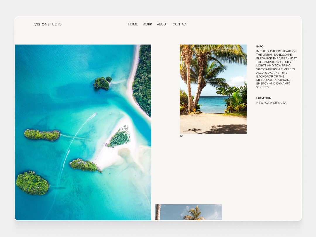 Vision Studio is a modern photography portfolio built for speed, control, and strong visual impact. Created for creatives who want more than just a gallery, it combines storytelling, motion, and interactivity into a smooth and engaging experience. Fully CMS-powered and optimized for performance, it is ready to grow along with your work.